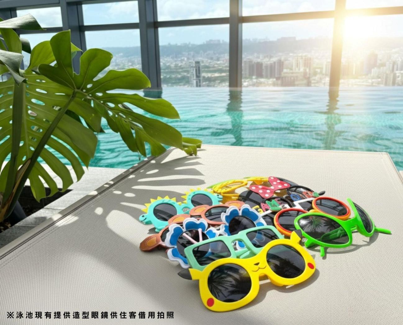 位於頂樓32樓的露天游泳池,長達33公尺、水深1.2公尺滿足客人戲水健身的需求,一旁座位區更規劃半開放式的竹藤包廂區提供與親朋好友聚會的隱密空間外、另外也有沙發區提供旅客休憩享受日光浴;而在植栽部份選用大量棕櫚樹及雞蛋花,營造渡假悠閒的舒適氛圍,讓來到此地的旅人們徜徉於高空樓層,遠眺大台北的城市風情;到了夜晚時分,配上燈光與音樂,一邊仰望滿天繁星,感受城市休閒的美麗風情。泳池更貼心備有各式趣味造型眼鏡,供賓客自由借用拍照,留下專屬於此的美好回憶。