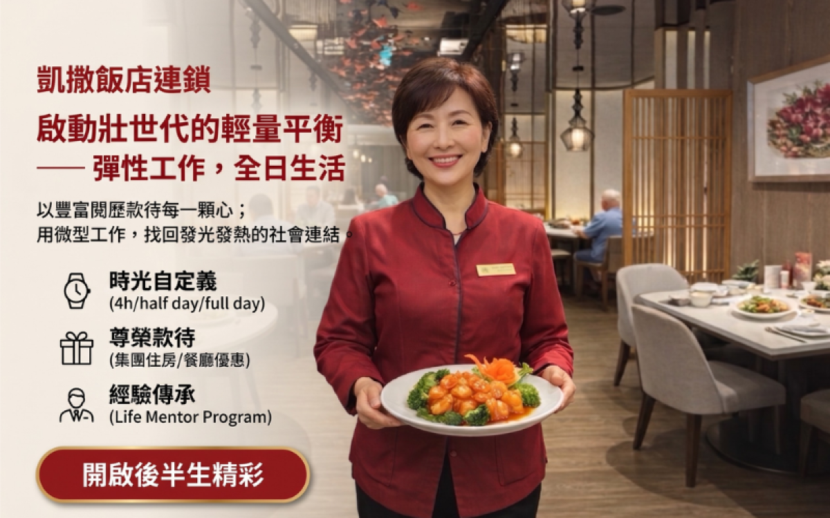 凱撒飯店連鎖憑藉穩健經營與優質服務,榮獲Agoda 2026年「金環獎」首屆「卓越品牌與服務表現獎」。凱撒飯店連鎖執行長皮金營表示,這份殊榮歸功於全體團隊,我們始終堅持品牌價值,為旅客打造完善的旅程體驗。號召「壯世代」夥伴,共創溫暖款待-面對產業轉型,我們強力徵求 45-65 歲的「壯世代」族群加入!我們看重您成熟的特質、穩定度與人生智慧,這正是提升服務品質最重要的「軟實力」。