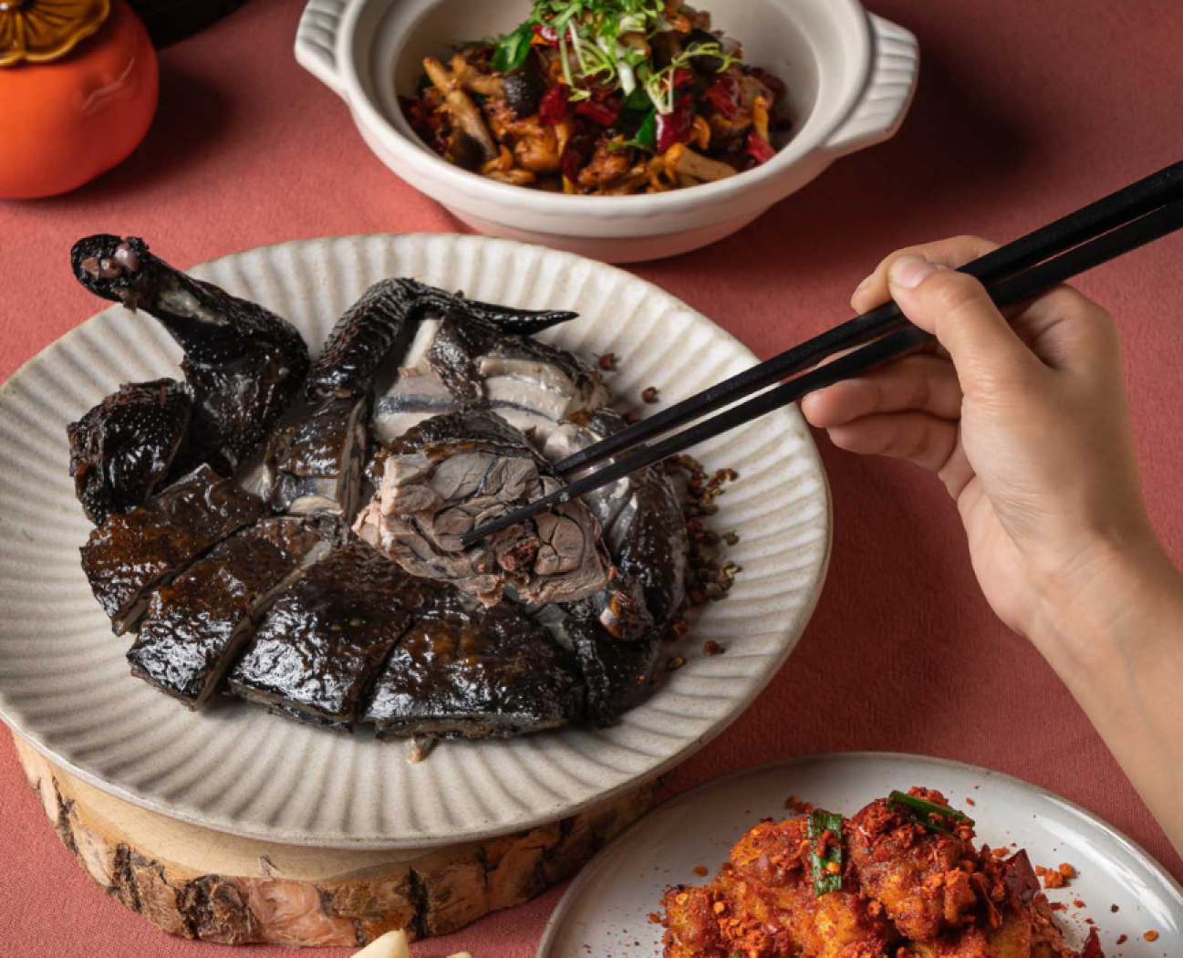 以金牌蒜香黑鑽雞為主角,佐以烏魚子脆米炒飯、蒜香烤松阪豬、琥珀上湯娃娃菜等多樣手路菜,展現中式餐桌的濃郁與層次。搭配尖椒松花皮蛋、蟲草燉雞湯與清蒸海上鮮,口味豐盛而均衡。整套菜色以經典家常風味升級呈現,適合團聚宴客。