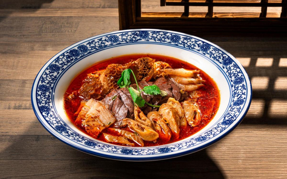 以鴨血、毛肚、大腸與豬五花等食材組合,搭配郫縣豆瓣與麻辣醬炒製湯底,層層堆疊出濃郁香氣。食材經處理後更顯入味,最後淋上熱油激發風味,呈現麻、辣、燙、嫩、脆交織的經典川味。